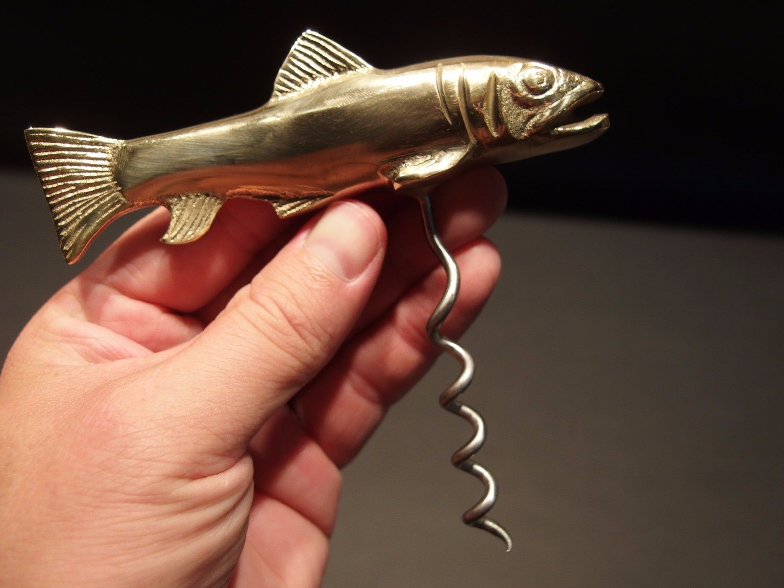 Antique Vintage Style Solid Brass Fish Wine Bottle Corkscrew