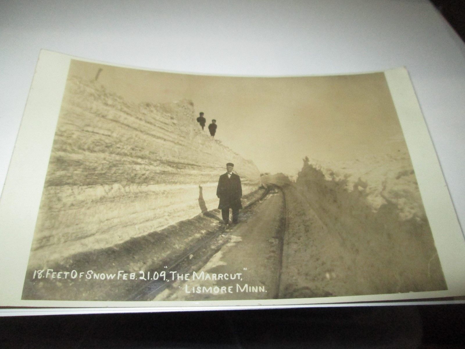 Lismore MN Minn RPPC Postcard - Ft of Snow Feb. 21, 1909 "THE MARRCUT" Railroad