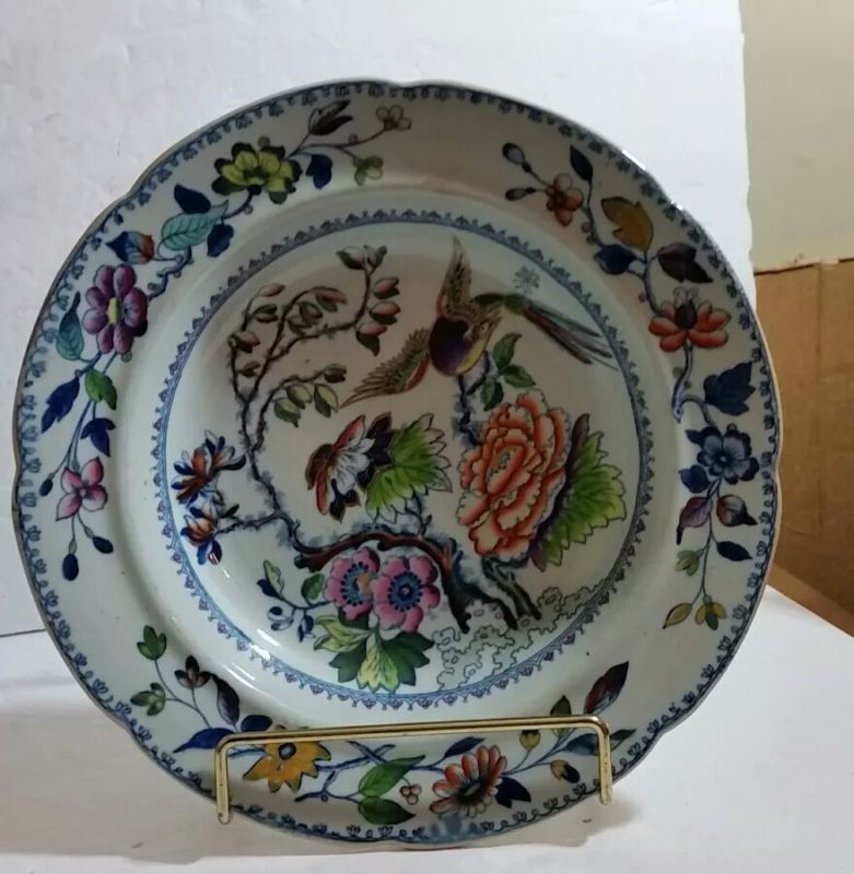 Title (ebay affiliate link): Antique Davenport Hand Painted Floral Stone China Oriental Rim Soup with Bird