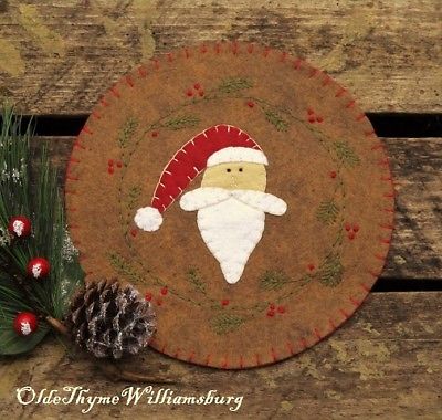 Title (ebay affiliate link): Primitive Stitchery CHRISTMAS Bittersweet Santa Penny Rug ~ Winter Candle Mat
