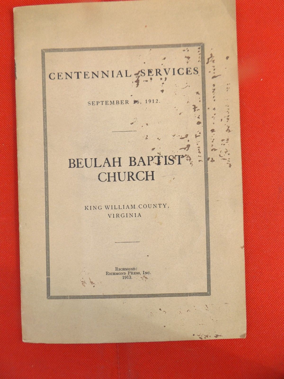 RARE 1913 Historical Sketch of Beulah Baptist Church, King William County, VA