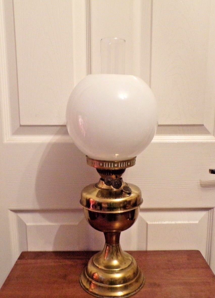 A vintage brass oil lamp with white shade Duplex twin burner working order