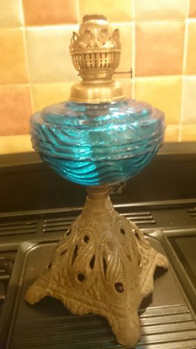 Title (ebay affiliate link): Stunning Antique Victorian Cast Iron Base Oil Lamp with Sapphire Blue Font