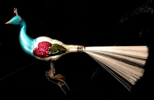 Title (ebay affiliate link): Vintage Peacock Ornament Blown Glass Turquoise Pink White Christmas Tree Clip