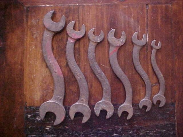 Title (ebay affiliate link): 6 ANTIQUE VINTAGE WRENCH S SHAPE HANDLES 1 - 7/8 TO 7/16 TOOLS DROP FORGE USA