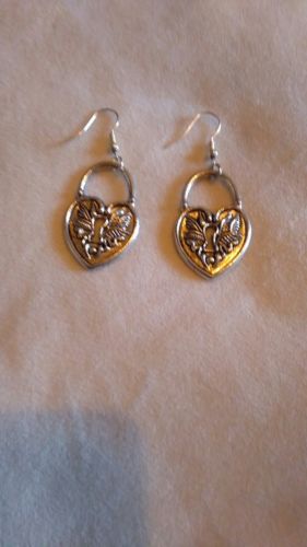 Silvertone padlock keyhole heart earrings