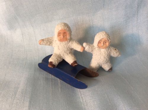 2 Antique Bisque Tiny Snowbaby Dolls & Tin Sled Christmas Putz Jane Withers Sale