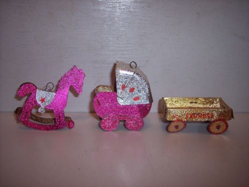 Title (ebay affiliate link): 3 Vintage Cardboard Christmas Ornaments Baby Bugg Rocking Horse and Wagon