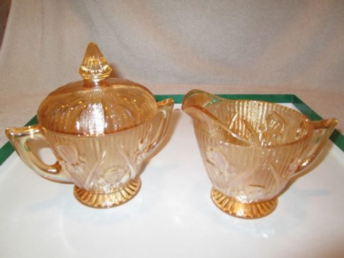 Title (ebay affiliate link): Vintage Jeannette Marigold Iridescent Iris Herringbone Covered Sugar & Creamer