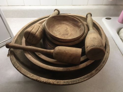 Lot Of 7 Vintage Primitive Wooden Bowls Plus 3 Wooden Tools