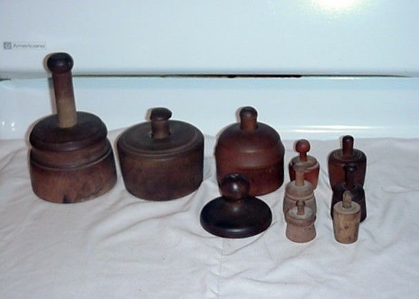 10 VINTAGE WOODEN BUTTER MOLDS/ 1 DATED APR. 17,1866