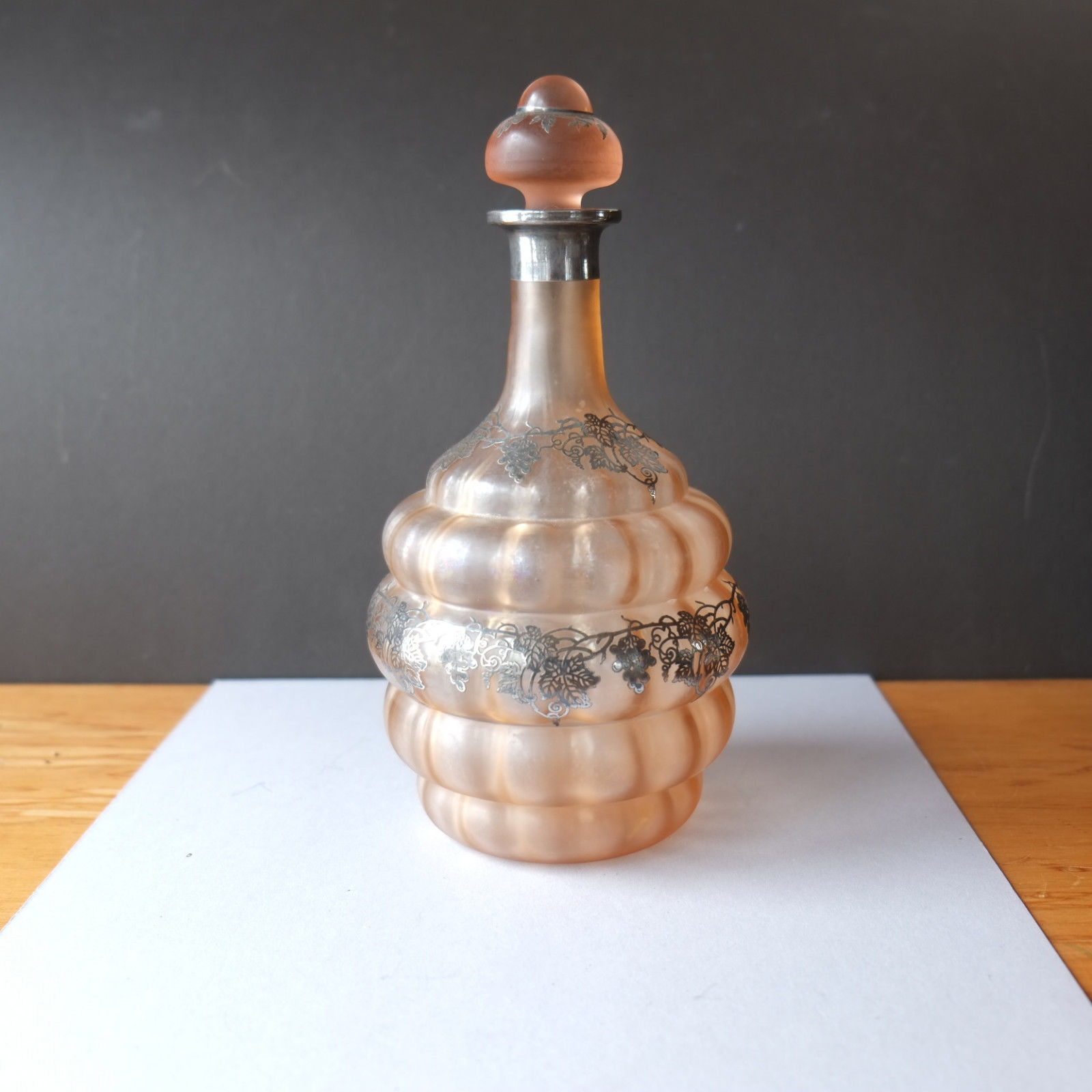 Antique Silver over lay wine carafe, decanter, peach color glass