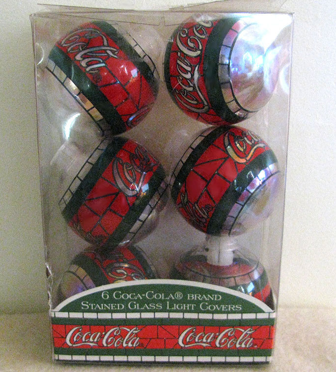 Title (ebay affiliate link): 1997 Set 6 COCA COLA Christmas Tree Stained Glass Light Cover Ornaments Plastic