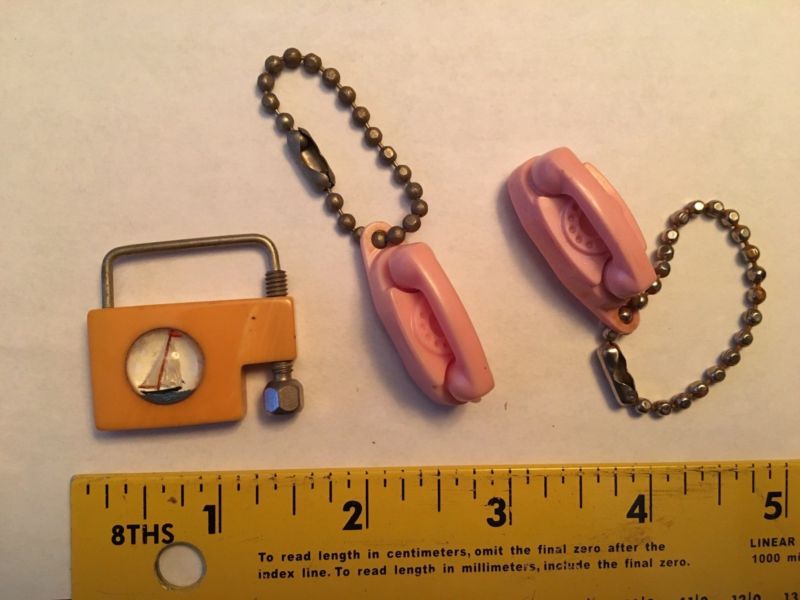 3 Vintage Key Chains: 2 Pink Princess Phones & Bakelite? Sailboat