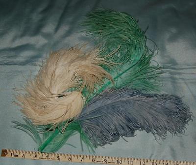 3 Antique Ostrich Feathers Blue White Green Restoration Dolls Millinery c1900