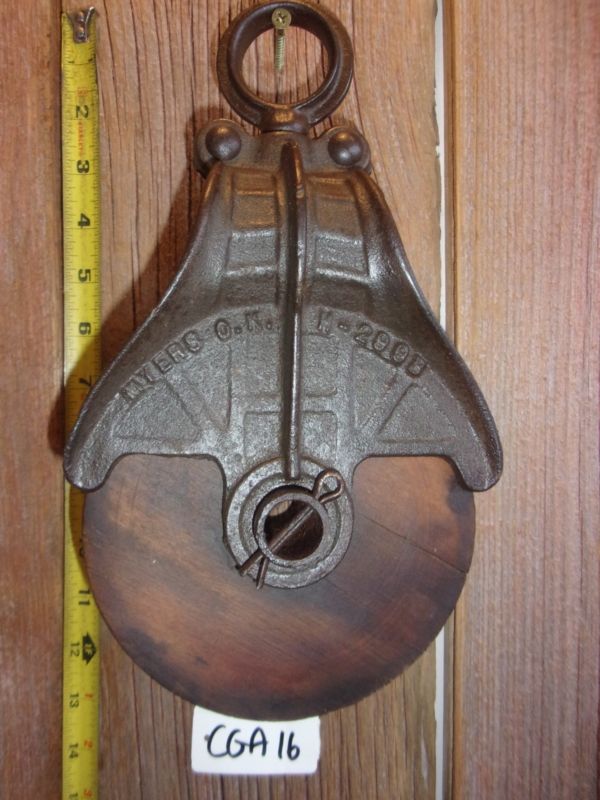 Title (ebay affiliate link): Vintage Myers Wood and Cast Iron Pulley Barn Farm Block and Tackle