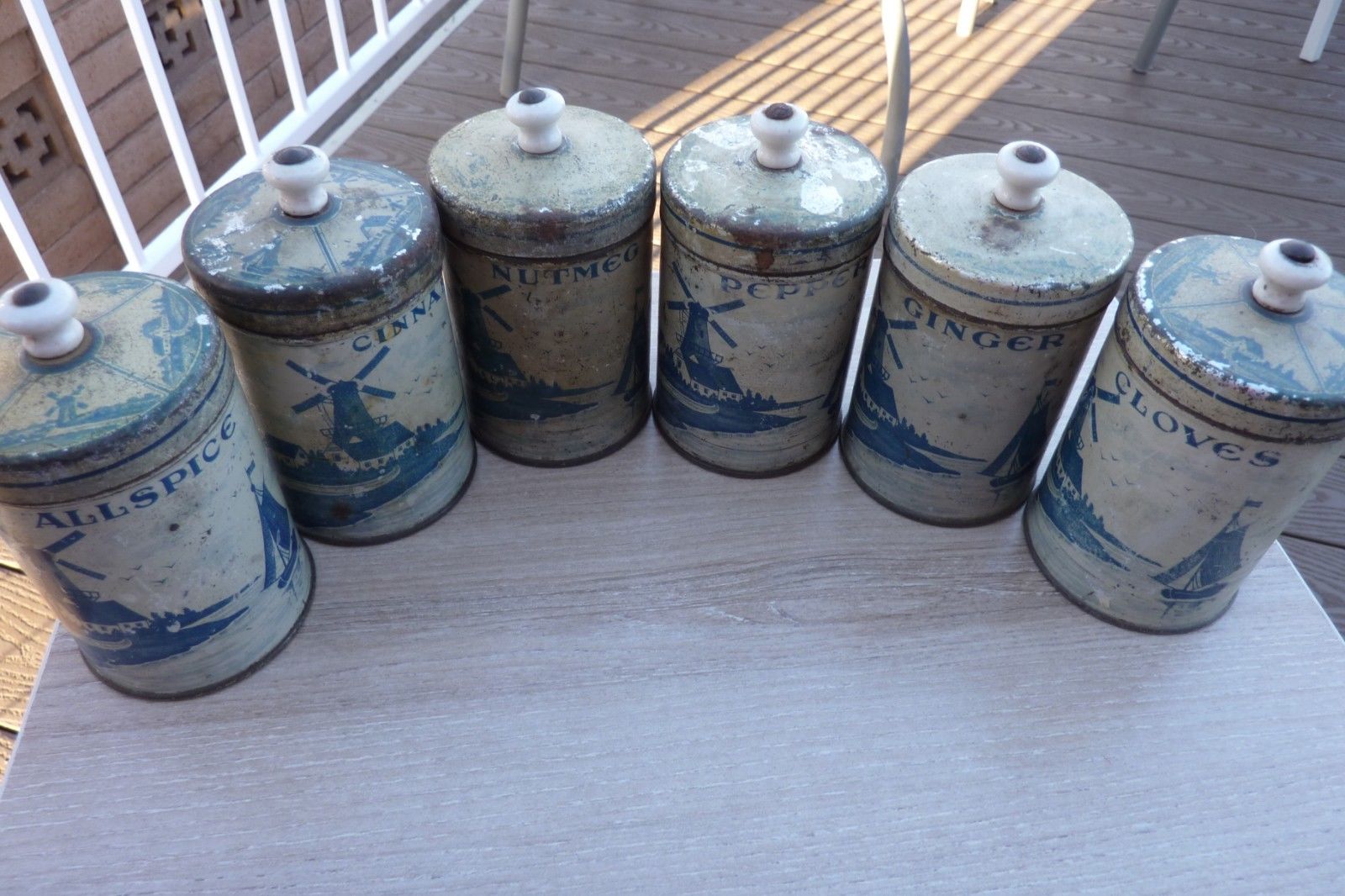 Lot of 6 Antique Tin Litho Dutch spice cans porcelain knobs