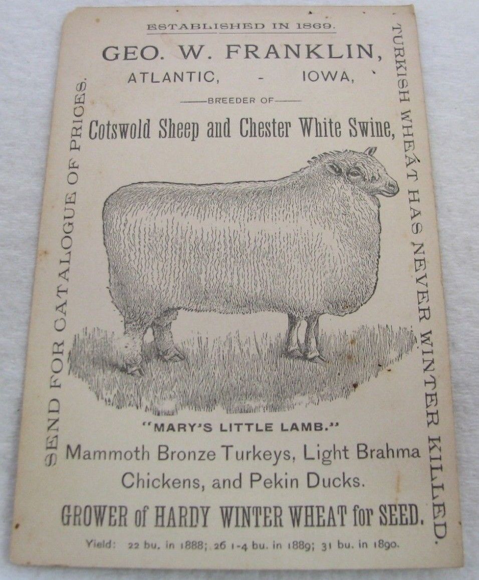 Title (ebay affiliate link): Antique Atlantic Iowa Sheep Chester White Swine Hogs Farm Advertising Trade Card
