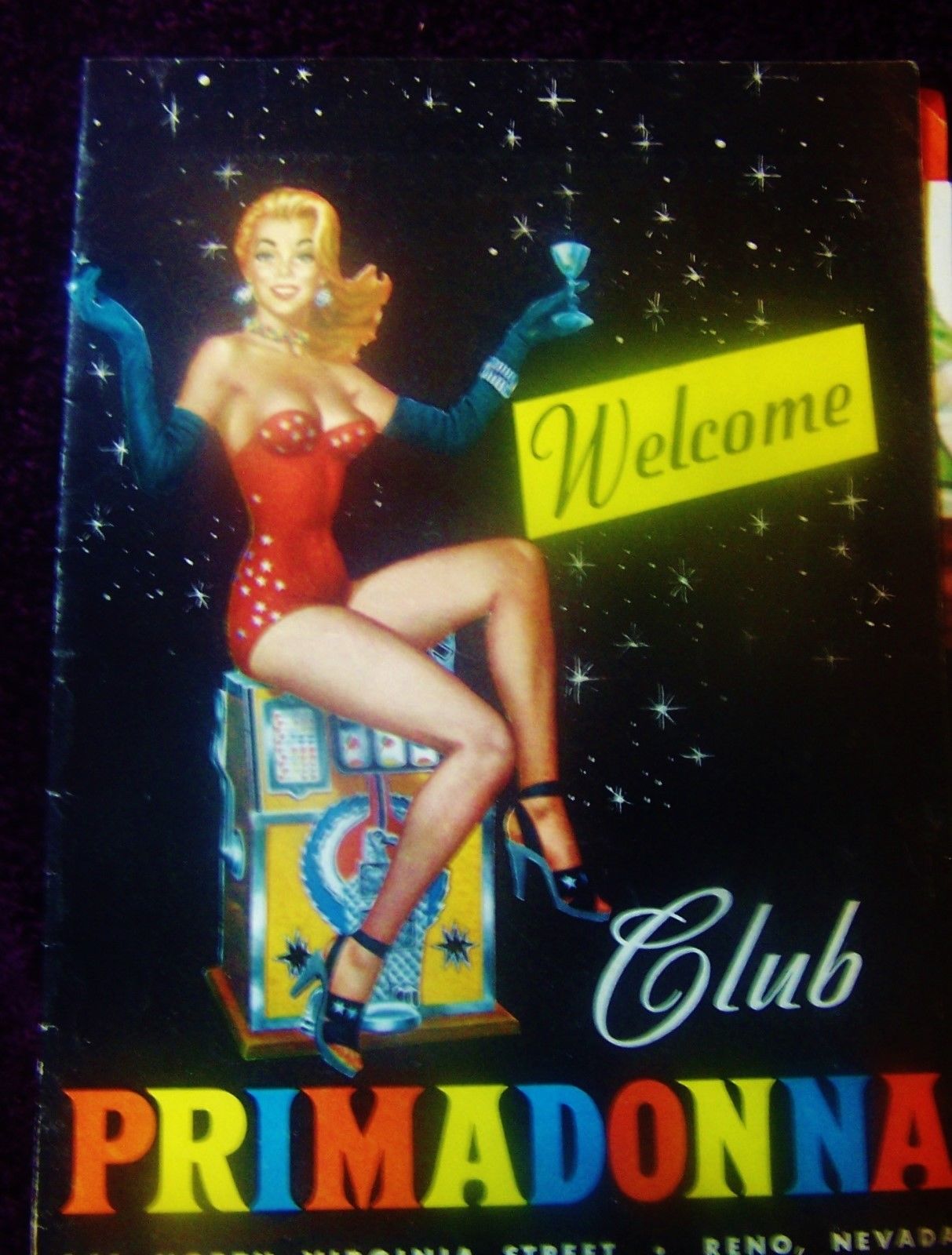 Title (ebay affiliate link): Rare Pre-1964 Club Primadonna Casino Poster Brochure Neon Slot Machine Reno Nev.