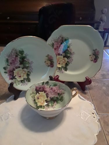 Title (ebay affiliate link): Vintage Stanley Soft Green Tea Cup & Saucer Set Huge Pink & Yellow & RED Roses