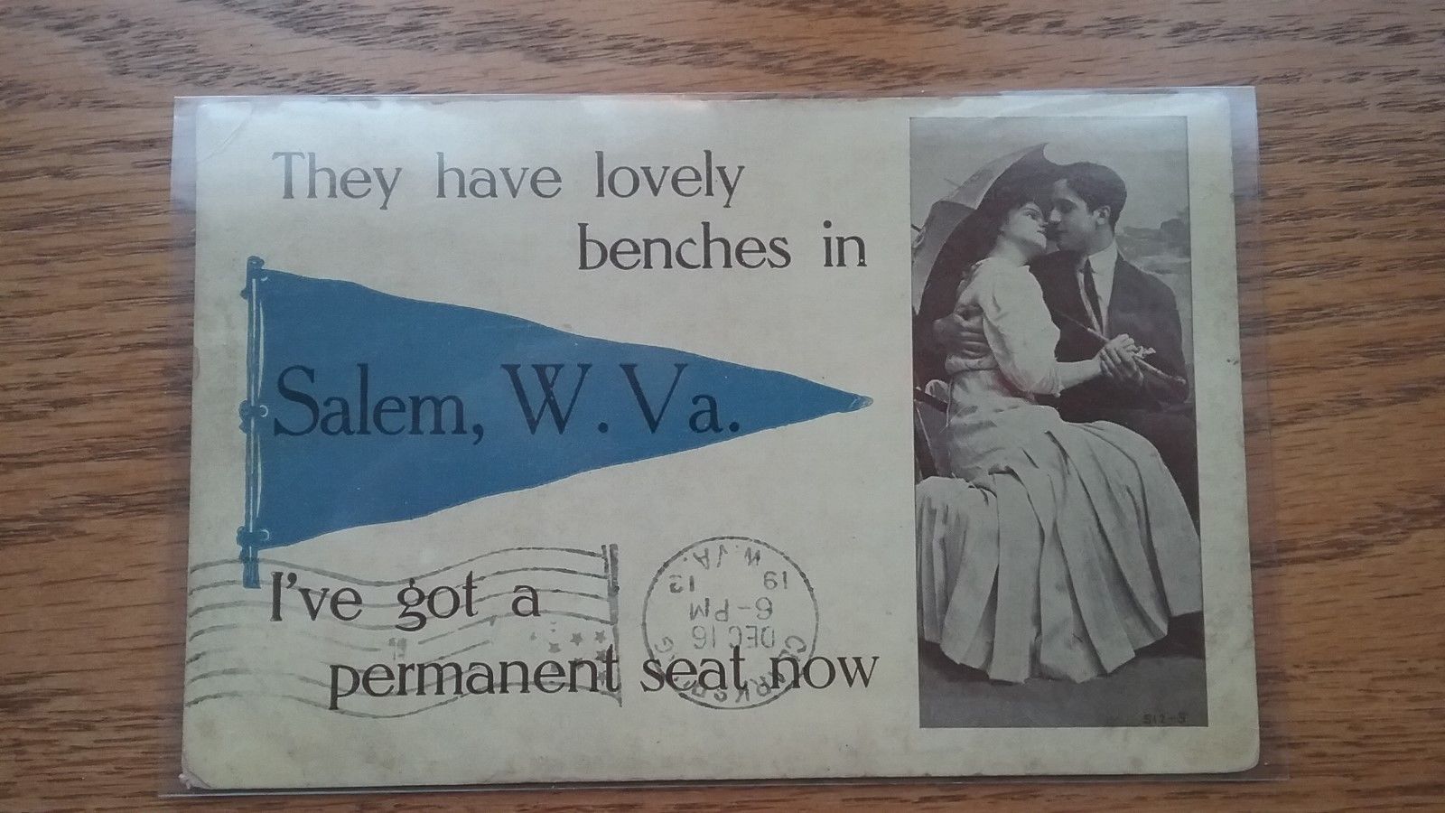 D22/ SALEM West Virginia WV Pennant Postcard THEY HAVE LOVELY BENCHES IN SALEM
