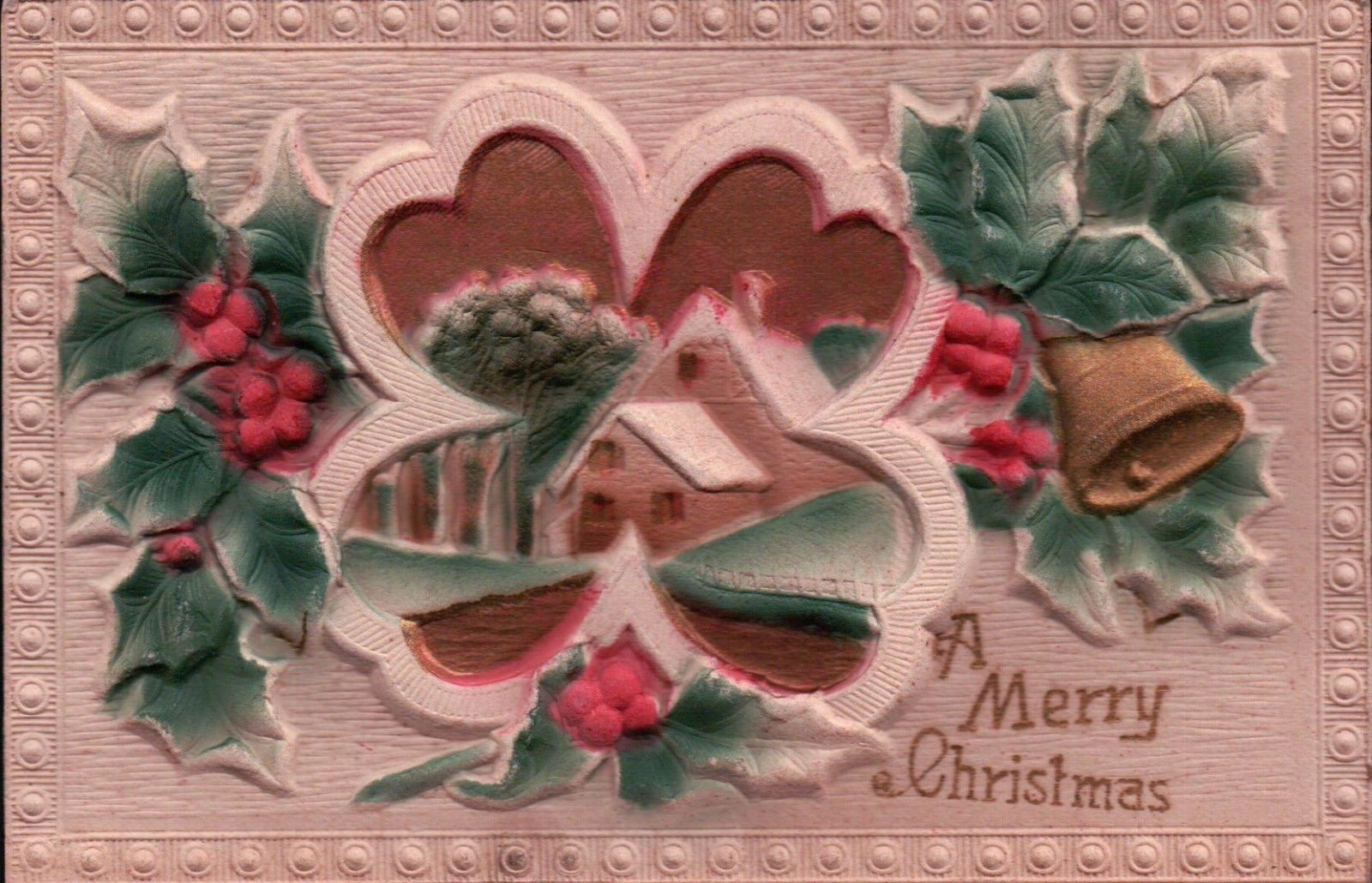 Highly Embossed Scene in Four Leaf Clover Christmas Vintage Postcard