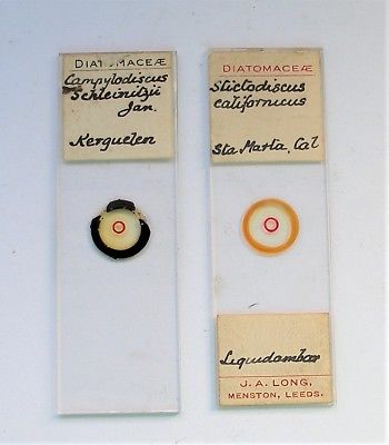 Title (ebay affiliate link): Pair x Antique MICROSCOPE SLIDES by J.A. LONG of Single DIATOMS