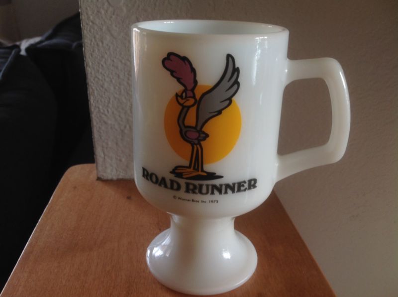 Title (ebay affiliate link): 1975 Warner Bros. Road Runner Milk Glass Cup Pedestal Marriott''s Great America