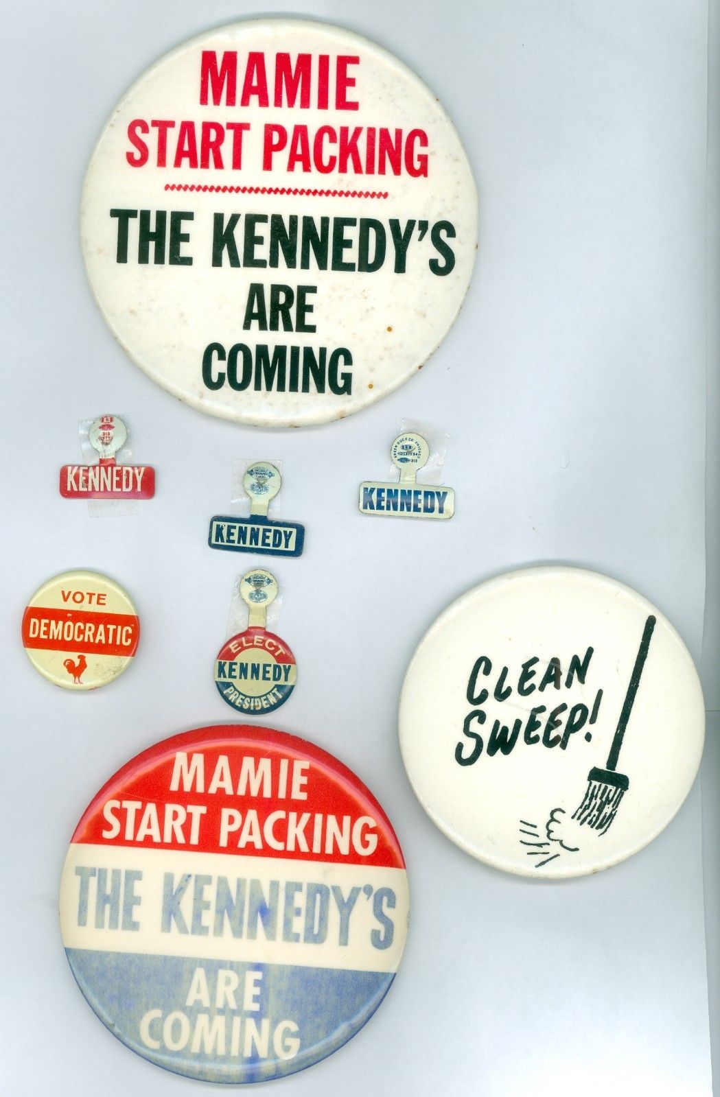 Title (ebay affiliate link): 4 Vintage 1960 President Kennedy Political Pinback Buttons &4 Tabs Mamie Clean