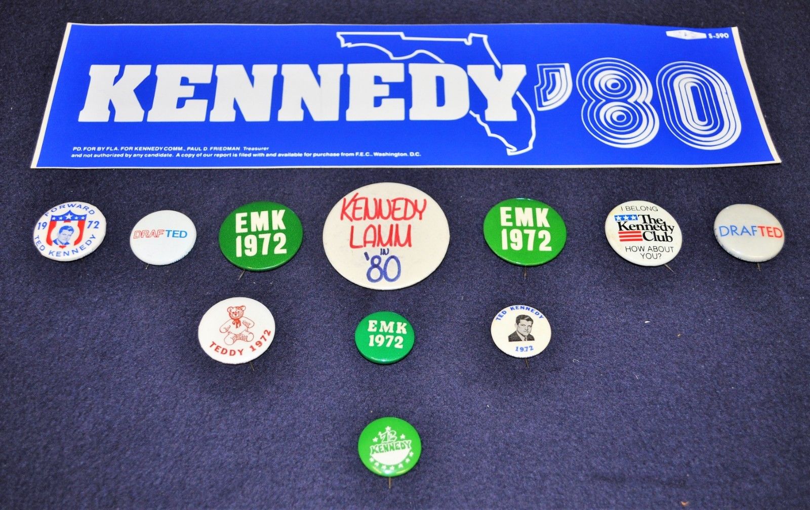 11 Vintage 1972-80 President Ted Kennedy Political Pinback Buttons &1 FL Sticker