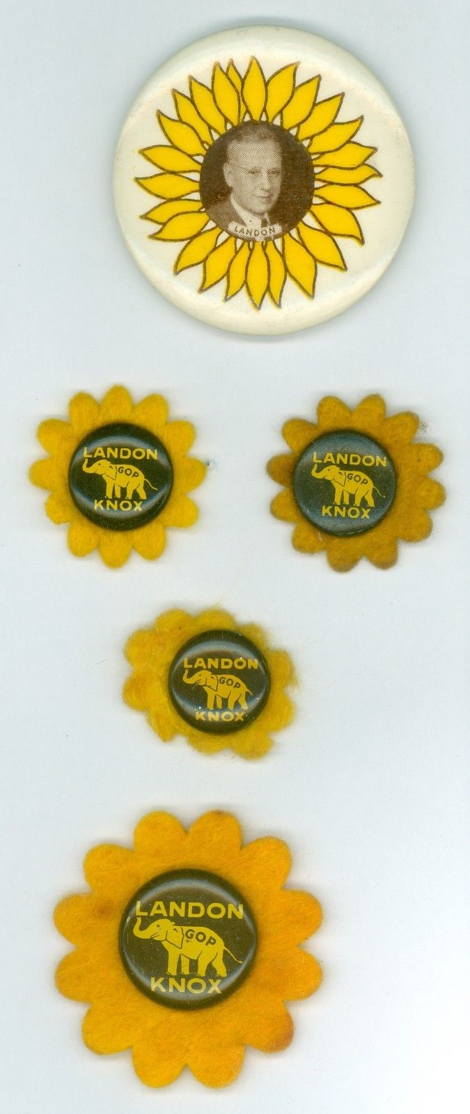 Title (ebay affiliate link): 5 Vintage 1936 President Alf Landon Political Campaign Pinback Buttons SUNFLOWER