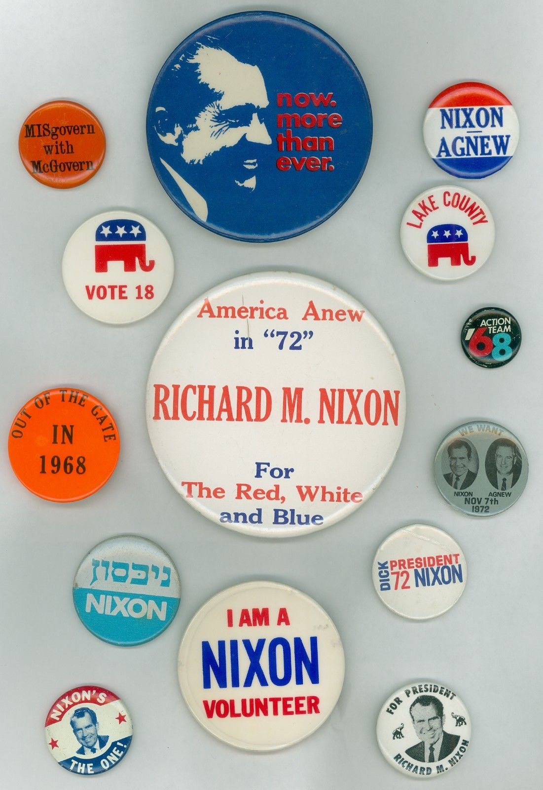Title (ebay affiliate link): 14 Vintage 1968-72 President Richard Nixon Political Campaign Pinback Buttons RW
