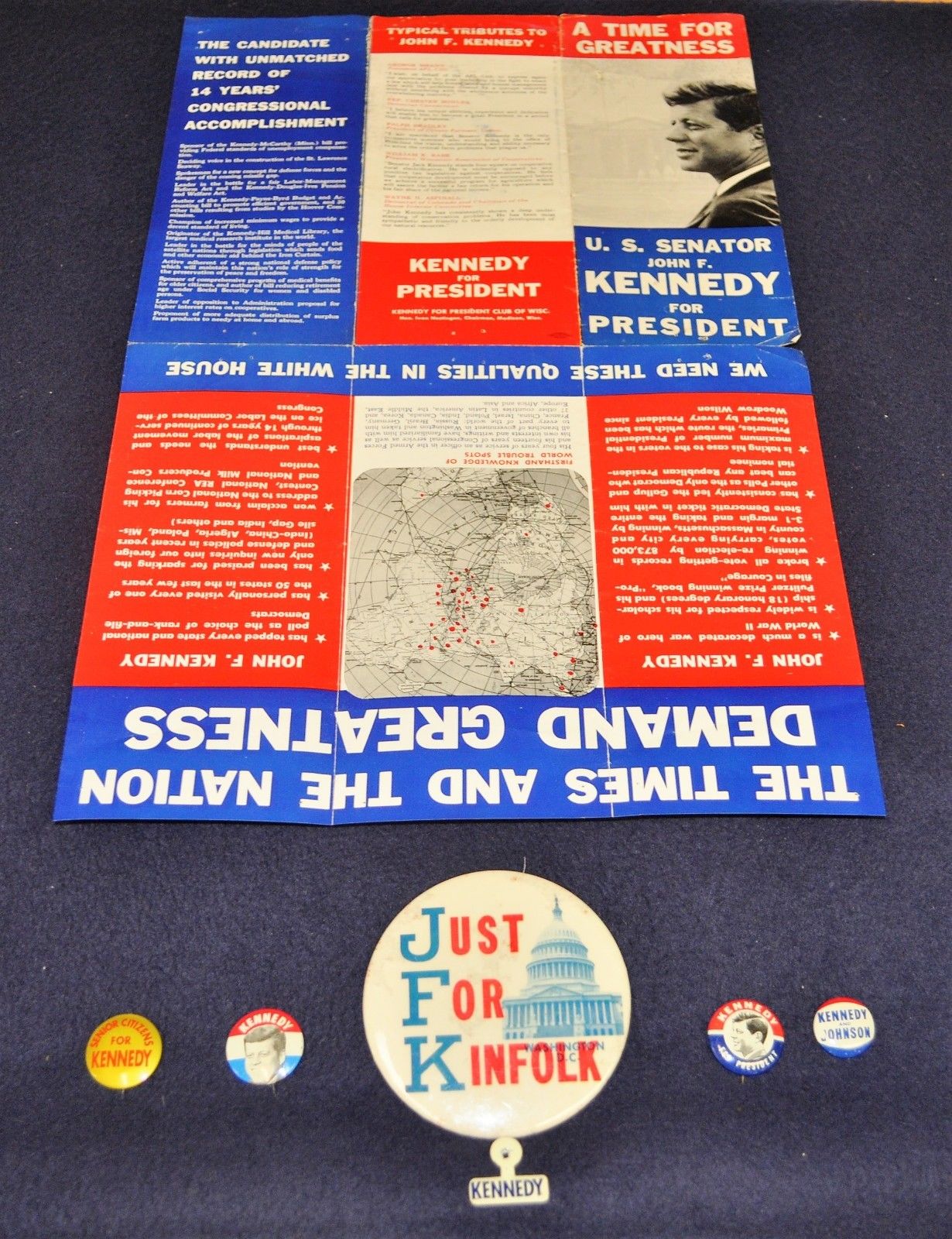 5 Vintage 1960 President Kennedy Political Pinback Buttons & Flier JFK-FL-35