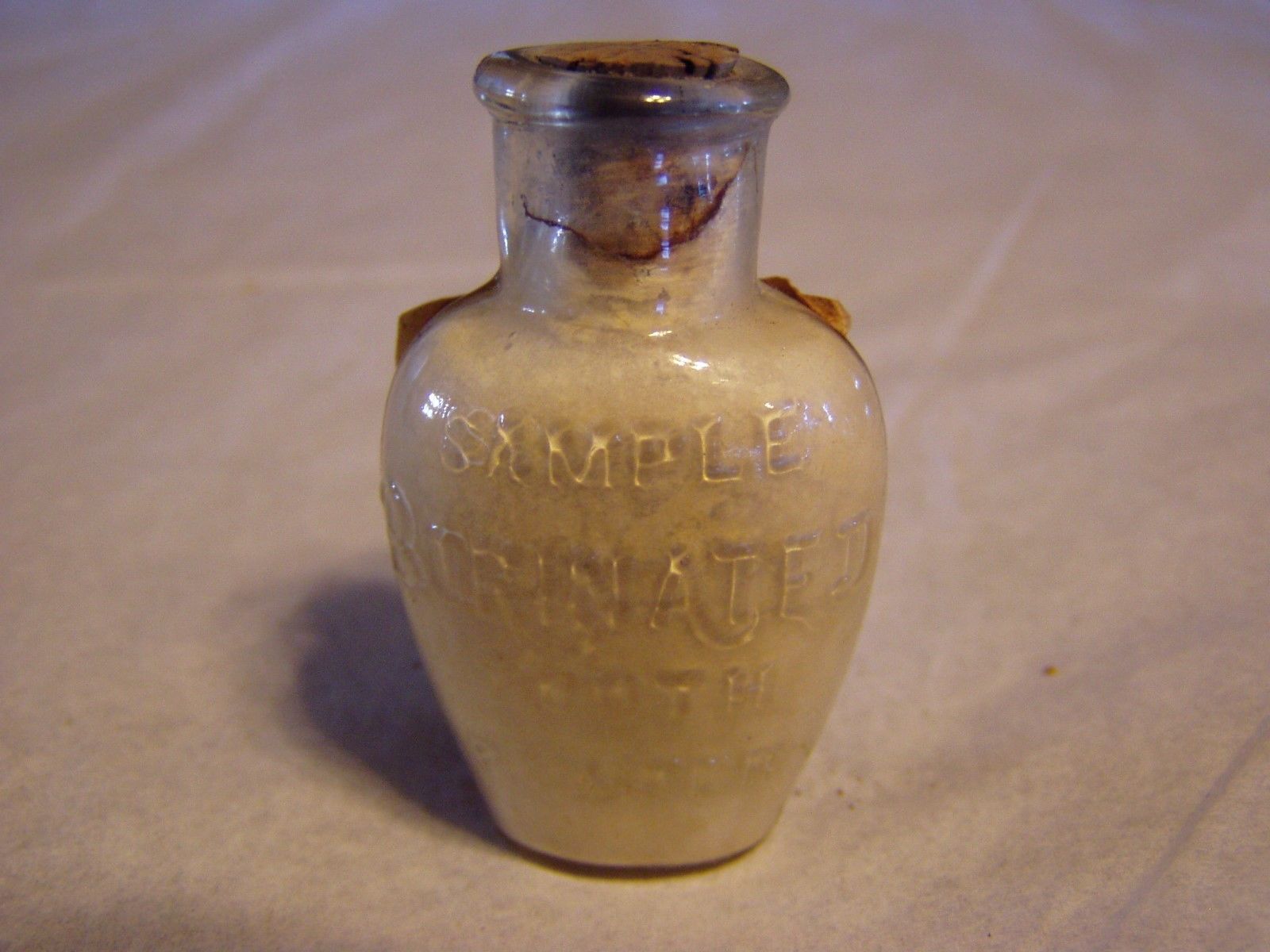 ANTIQUE NOS EMBOSSED BORINATED TOOTH POWDER SAMPLE GLASS APOTHECARY BOTTLE