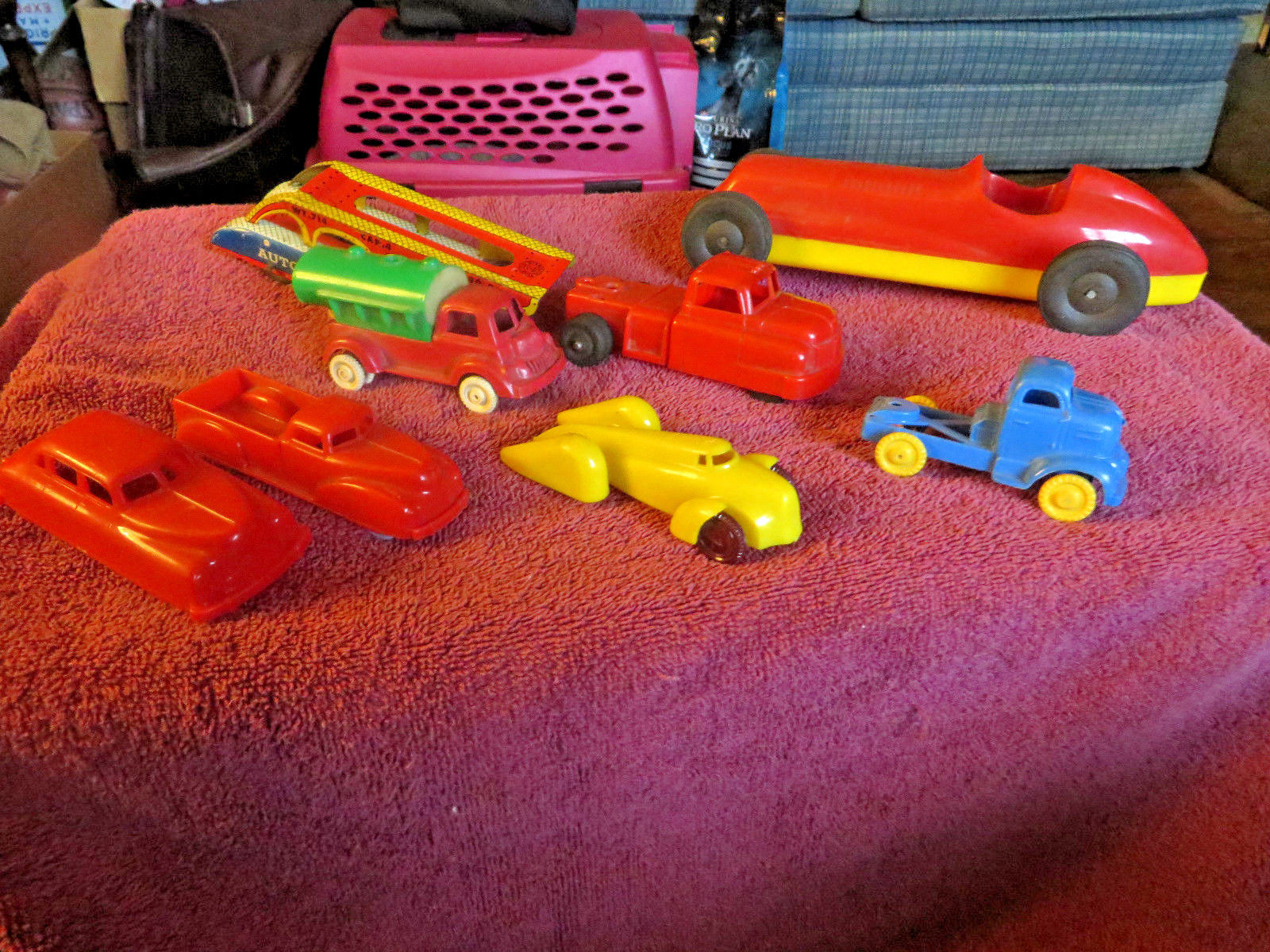 LOT OF 8 VINTAGE PLASTIC TOY CARS,TRUCKS,RENWAL,BANNER,WYANDOOTE,MYSTERY