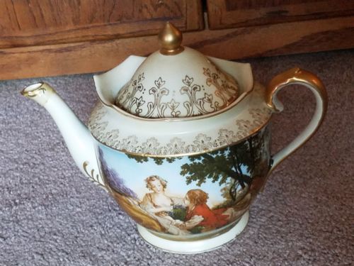 Title (ebay affiliate link): Antique/Vintage Porcelain Musical Tea Pot~Hand Painted Francois Boucher~Pretty