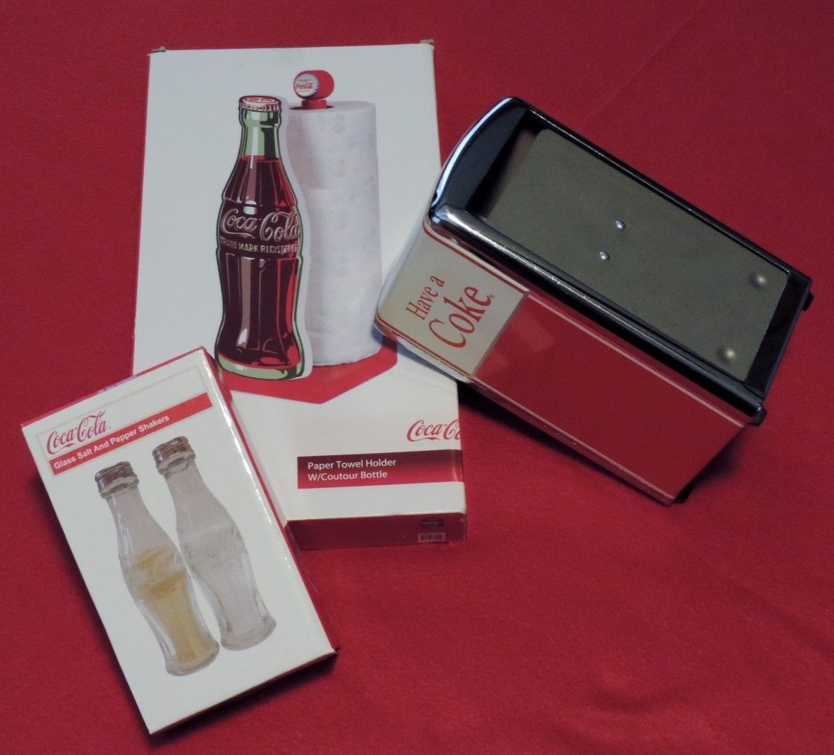 Title (ebay affiliate link): Coke Coca Cola Bottle Paper Towel Napkin Dispenser Salt Pepper Shakers New Used