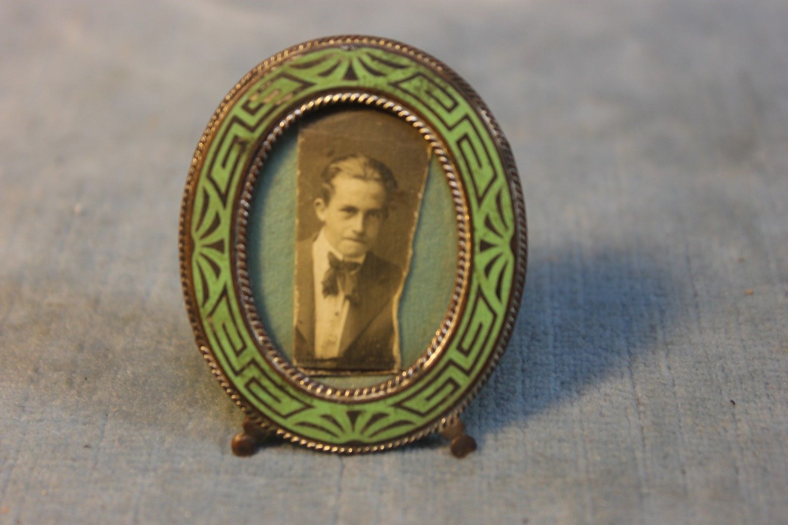 ANTIQUE GREEN ENAMEL ART DECO MINI OVAL VICTORIAN PICTURE FRAME 1 3/4"