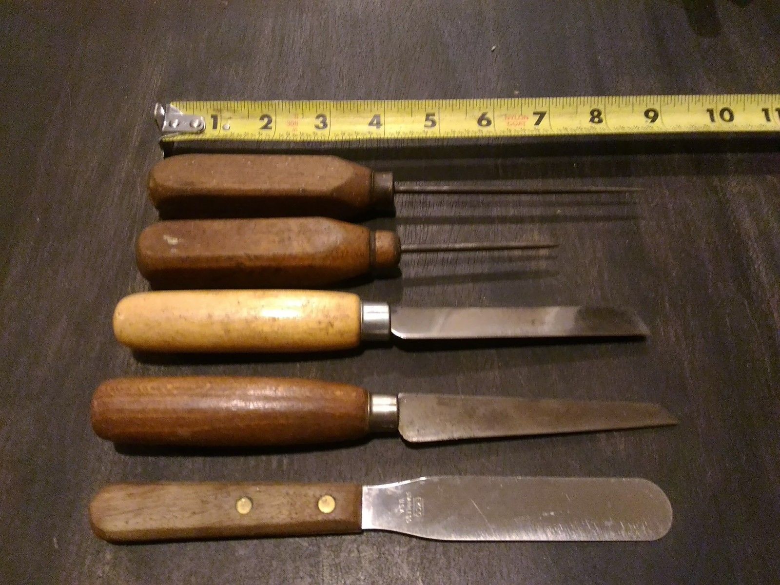 Title (ebay affiliate link): VINTAGE WOOD HANDLE TOOLS Picks Awls Knives Spatula