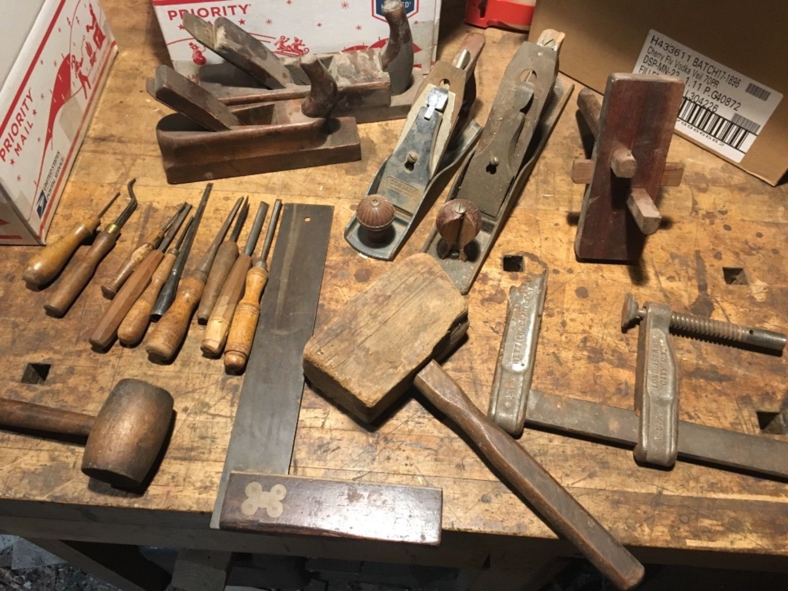 Title (ebay affiliate link): box of vintage tools, Wetzler clamp, chisels planes