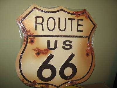 ROUTE US 66 METAL SIGN-RUSTIC LOOKING-BULLET HOLES
