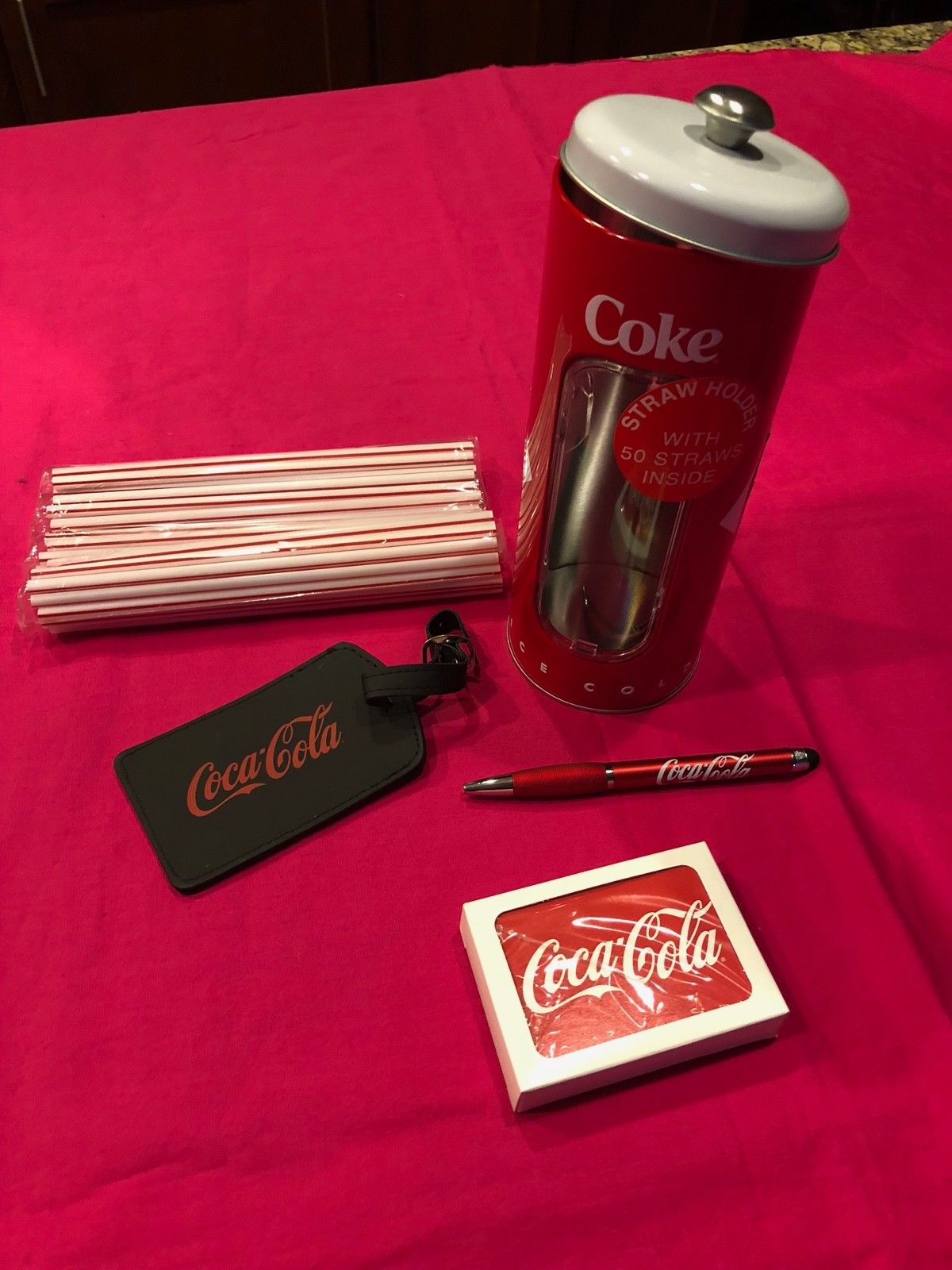 COKE Coca-Cola Straw Tin Holder - BONUS Playing Cards - Ink Pen - Luggage Tag