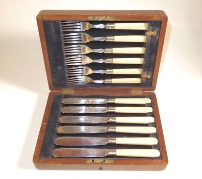 Title (ebay affiliate link): NICE 19TH CENTURY CASED SET OF 6 PAIRS OF CUTLERY WITH SILVER COLLARS
