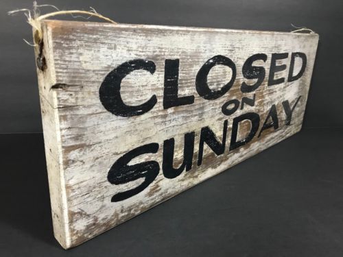 Title (ebay affiliate link): Wonderful 19th C. Double Sided Wooden Painted Sign "Closed On Sunday" C. 1880 NR