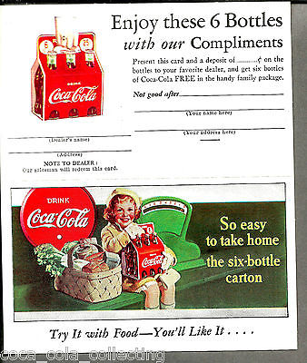 Original 1930''s - 40''s Free Coca-Cola 6 Pack Coupon & Advertising Card, NOS