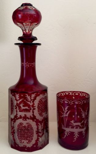 Vintage Ruby Red Cut Glass Decanter & Cup Bohemian Deer 2 Pieces