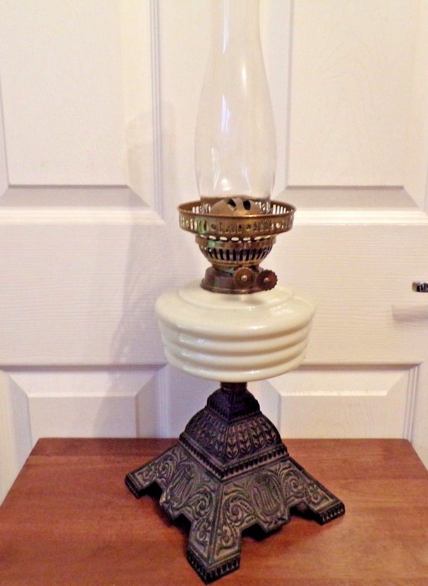 Title (ebay affiliate link): Victorian oil lamp Milk glass font cast iron base working order