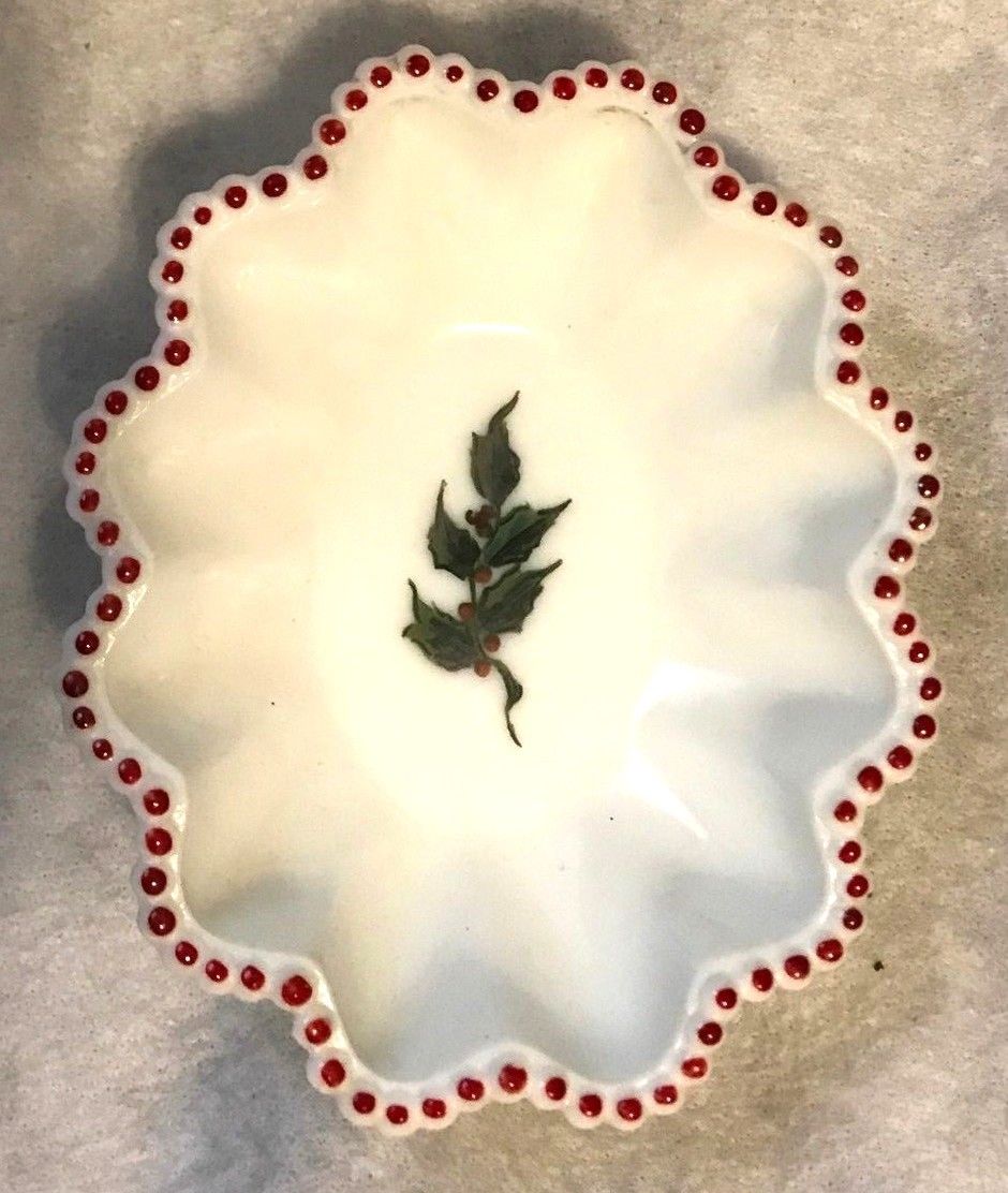 VINTAGE WESTMORELAND MILK GLASS HOLLY LEAF & BERRY WITH RED DOT EDGE OVAL DISH