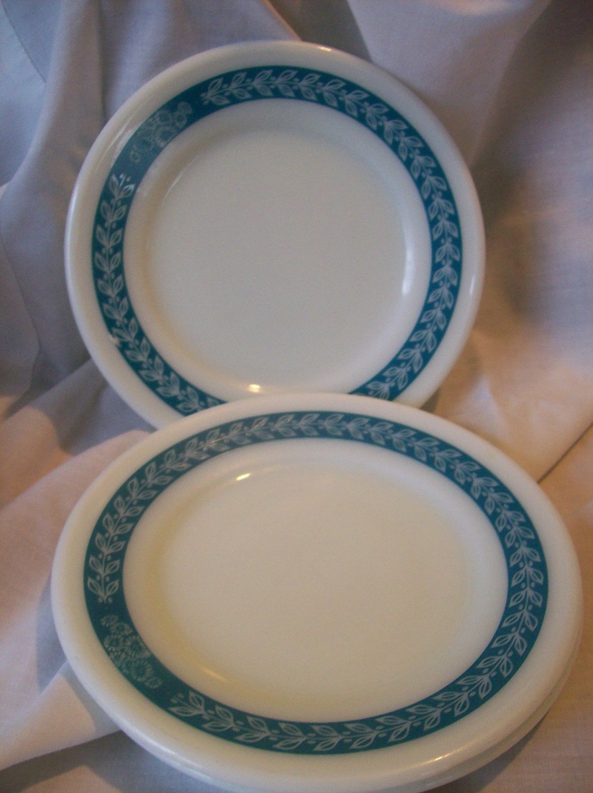 Title (ebay affiliate link): 3 Pc Corning/Pyrex Milk Glass Saucer/Desser Plates Laurel Autumn Leaf Turquoise