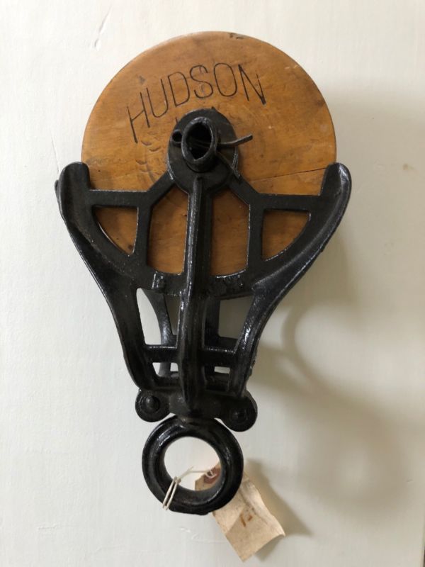 Title (ebay affiliate link): Antique Pulley Hudson Cast Iron & Wood Barn Hay Trolley Patina Old Vtg Farm Tool